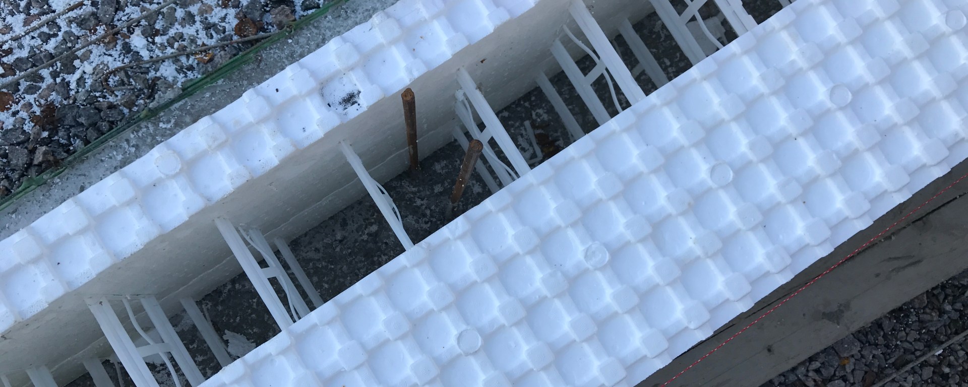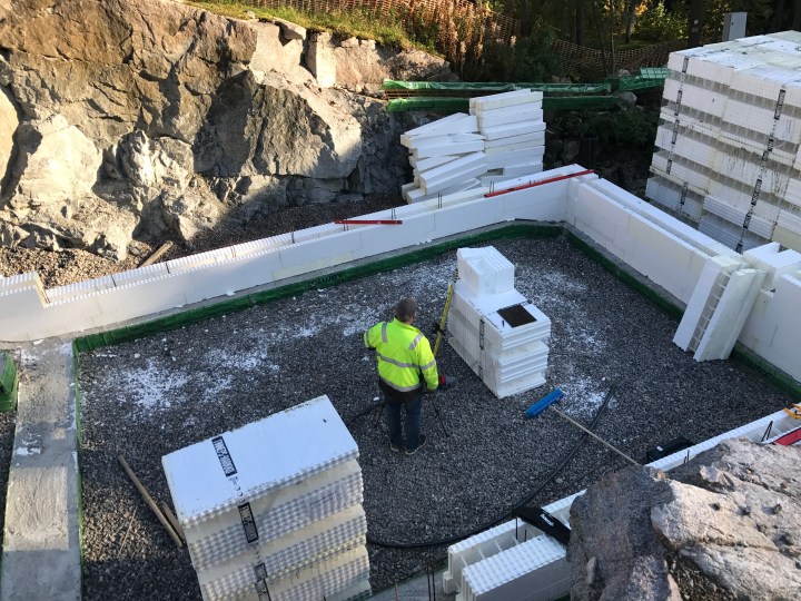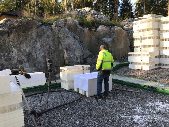 Kuvassa on anturoiden päälle lähdetty ensimmäisiä harkkoja mallailemaan. Tärkeitä työkaluja tässä olivat vatupassi ja laser, saha ja liima. Kun ensimmäisen kerroksen saa suoraan on seuraavat kerrokset jo paljon helpompia kasata.