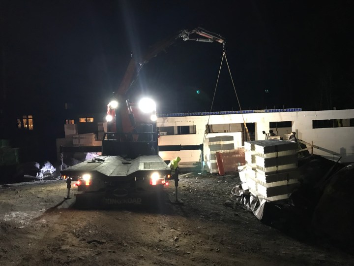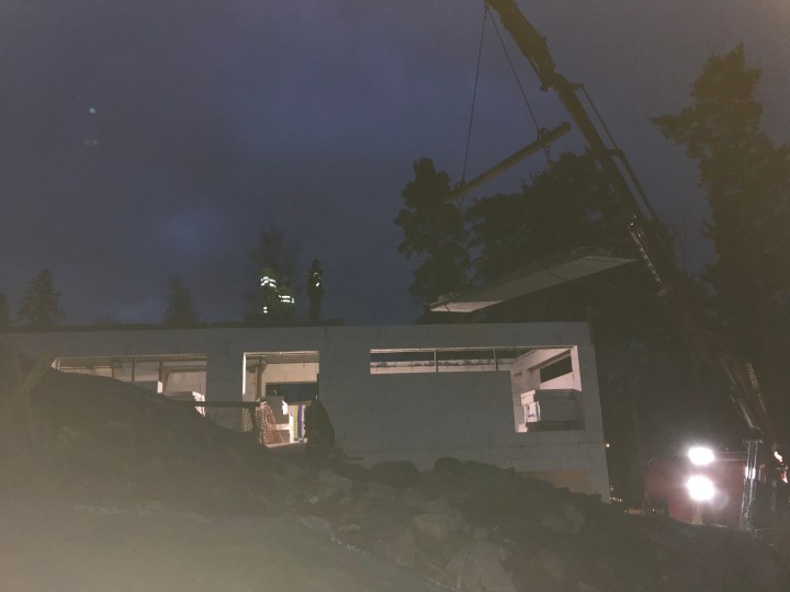Tänään mentiin taas suuri harppaus eteenpäin tontilla. Ontelolaatat tulivat vihdoin, vain noin viikon myöhässä. Ja ne olivat suurinpiirtein oikean mittaisiakin, ainoastaan yksi jäi 70mm vajaaksi. Joka tapauksessa, kaikki on nyt nostettu ja ylimmän kerroksen rakentaminen voi alkaa. Muutaman päivän päästä on tulossa betoniauto ja edessä on ontelokentän saumaus. Ja heti perään seuraava betoniauto seinävalua varten.